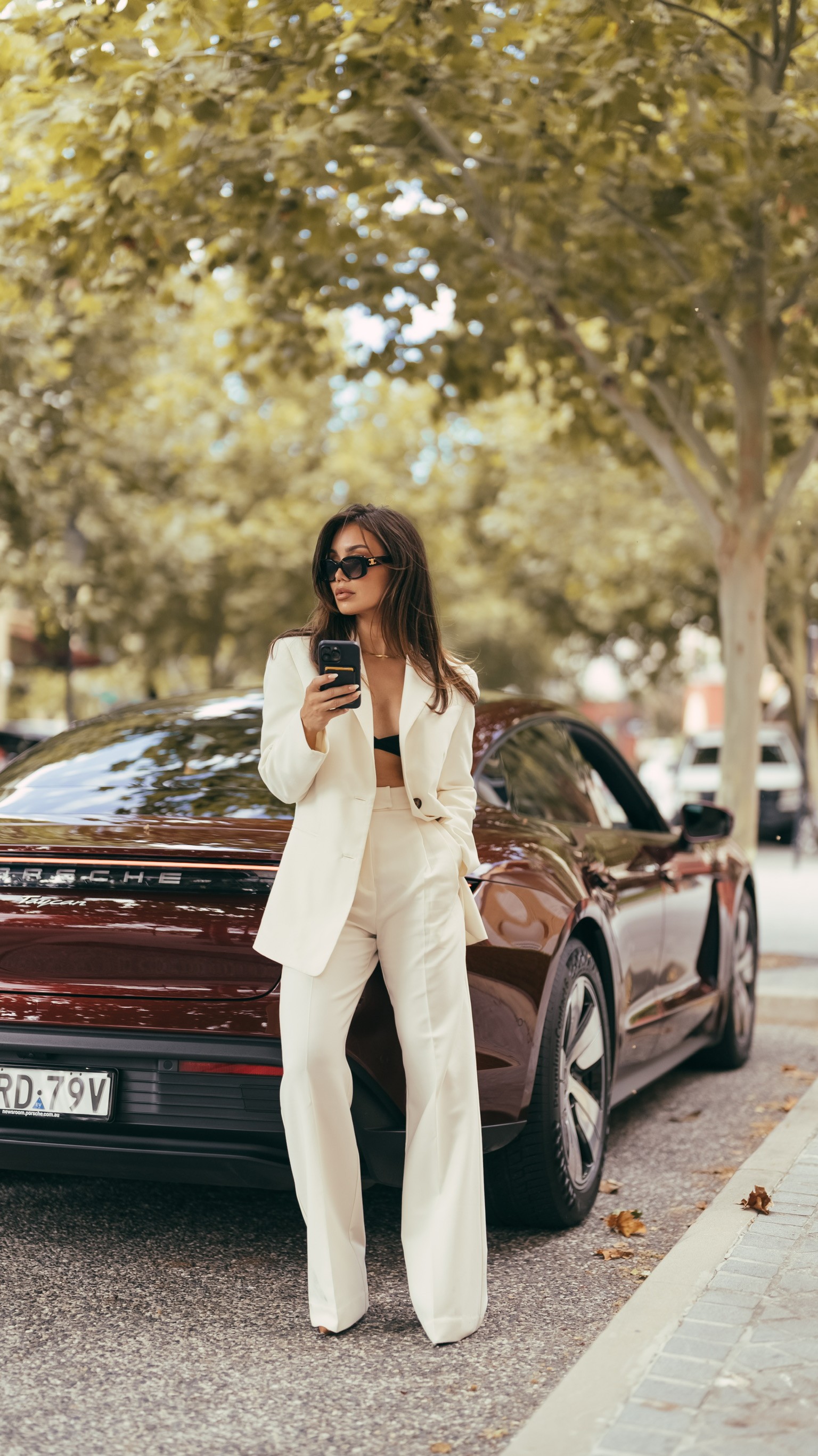 Pia Muehlenbeck walking around a Porsche Taycan to the office